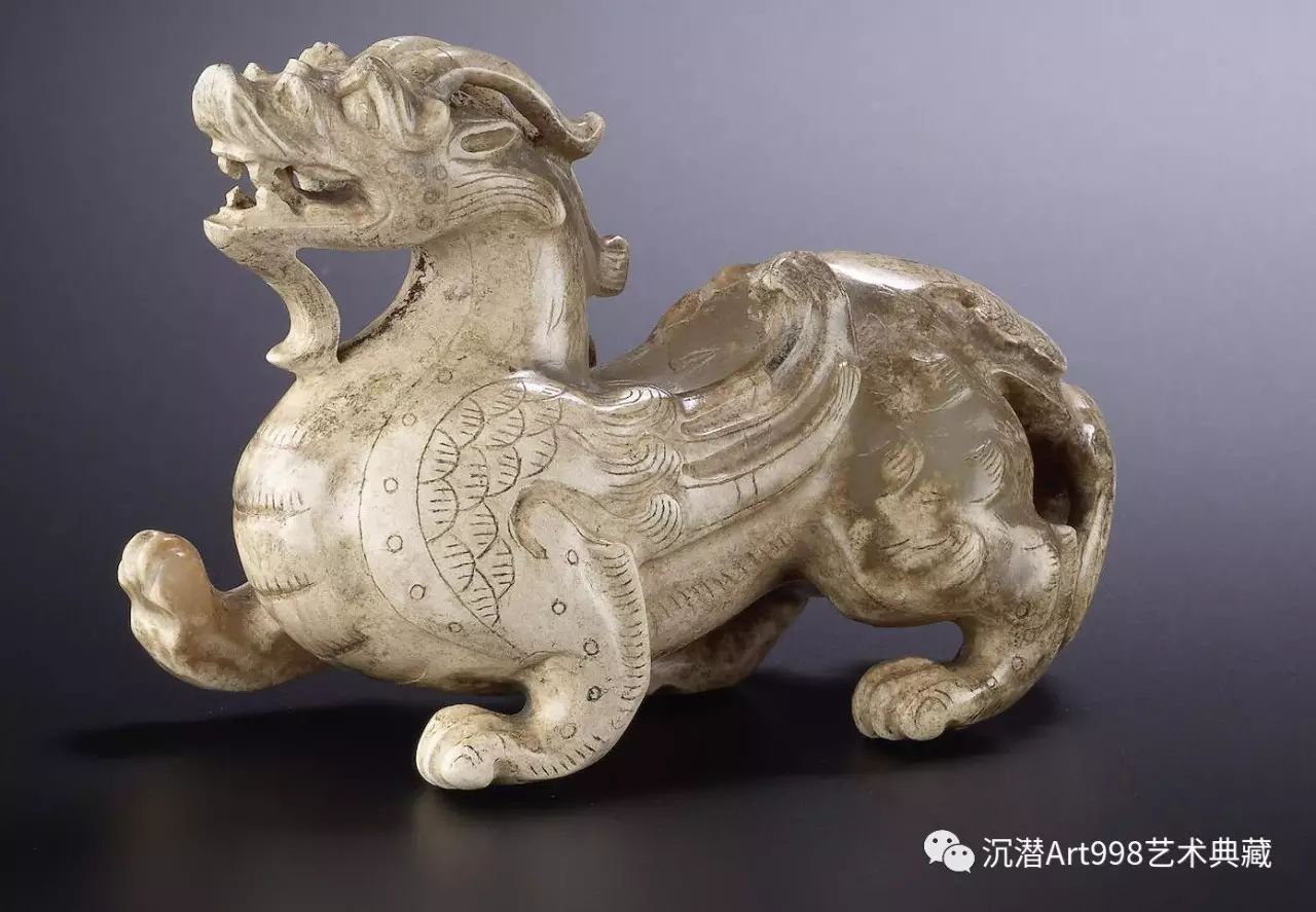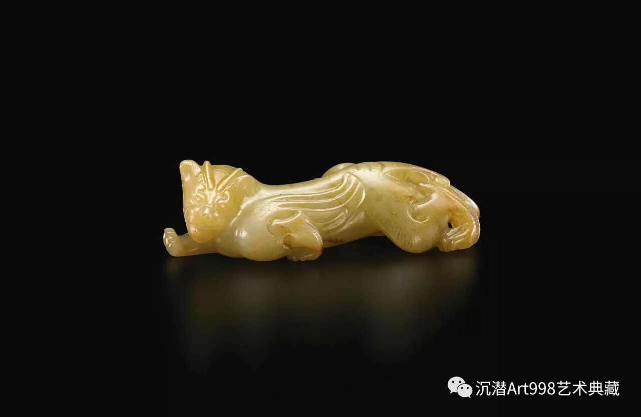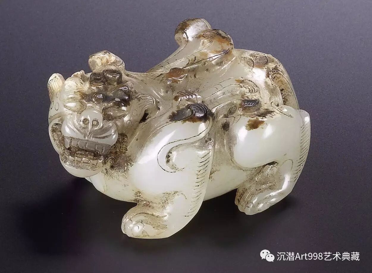 何鴻卿爵士所藏玉獸較之本品,尺寸略小(8.4 公分),造型特徵卻極近:皆怒目圓瞪,四爪鋒利,蓄勢待發;輪廓線條流暢,為典型漢代早期玉雕風格,深刻條紋分佈全身,凹凸層次分明,立體感十足;雙翼由肩部而出,長尾捲曲;並巧用玉石天然沁色,與整體相融。