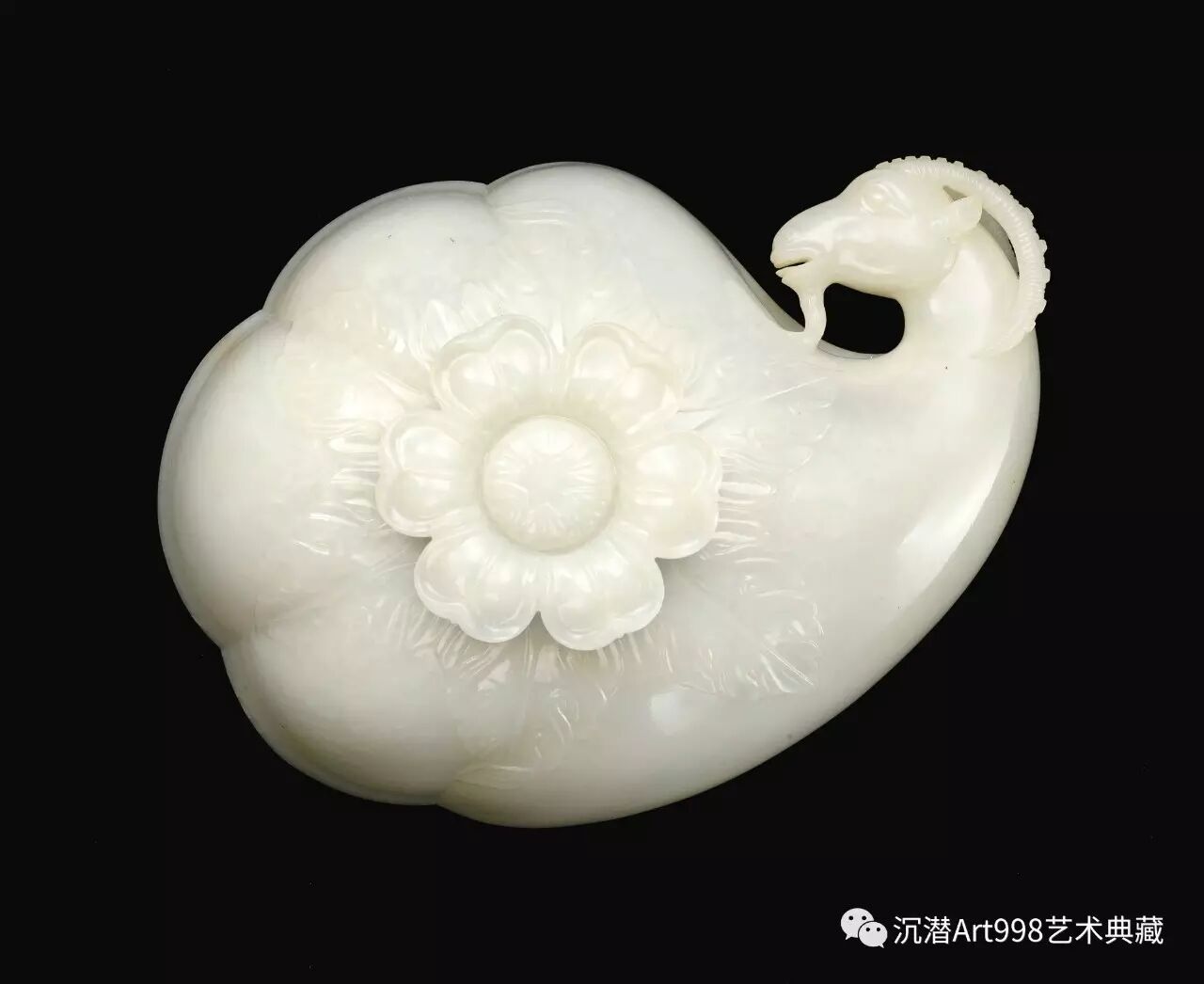 此盃玉質淨白,工藝細膩,造形陽剛有力,羊首面容生動,下頦鬚鬍彰顯力度,線條微彎融入瓜形盃身,盃足作蓮花盛放,外壁細琢蜷曲枝葉。玉色乳白淨潔,彷若世外之物,深得乾隆帝慕奇之好。