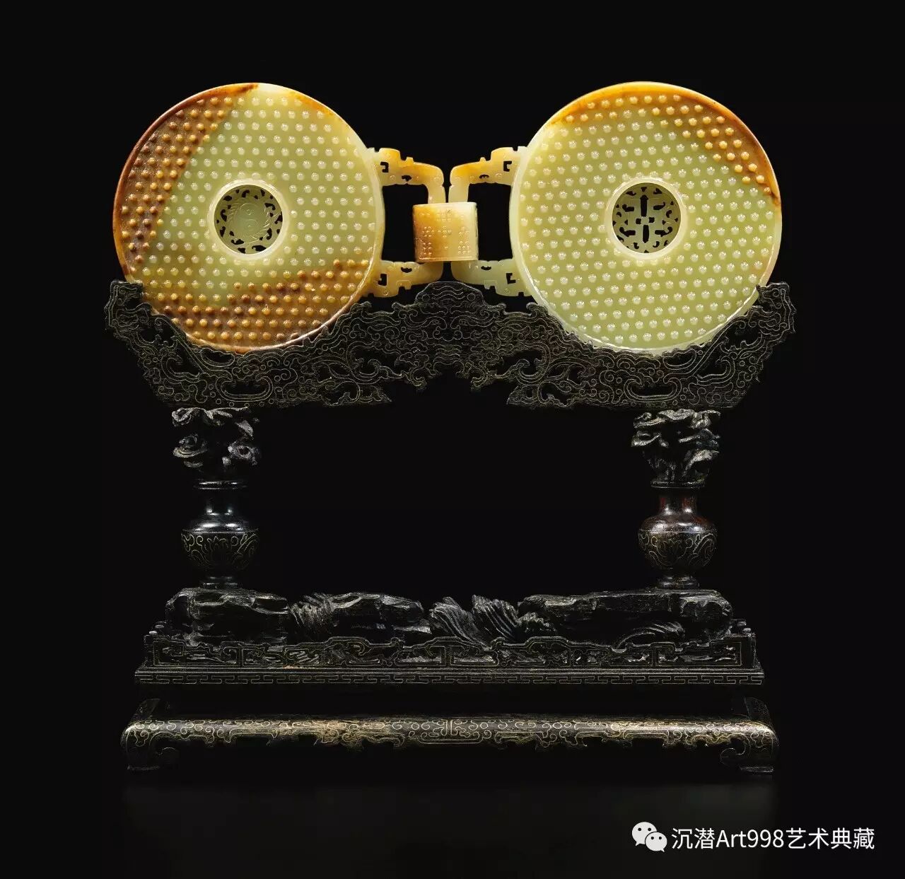 學古而出新,紮根中國傳統文化。乾隆一朝,高宗秉持此道,好藏善鑑,幾暇之時,賞宮廷蓄貯殷周青銅、兩宋雅瓷、高古美玉等。其美學品味、崇古之好,對清中期文藝發展,影響極深,是以時興復古之作,形形式式,此玉雙聯璧正為當中佳例。玉質溫潤,綴以褐斑仿玉沁,巧雕雙璧妙相連,樸雅精緻兼備,極盡模古之意,更顯乾隆一朝之精湛工藝。