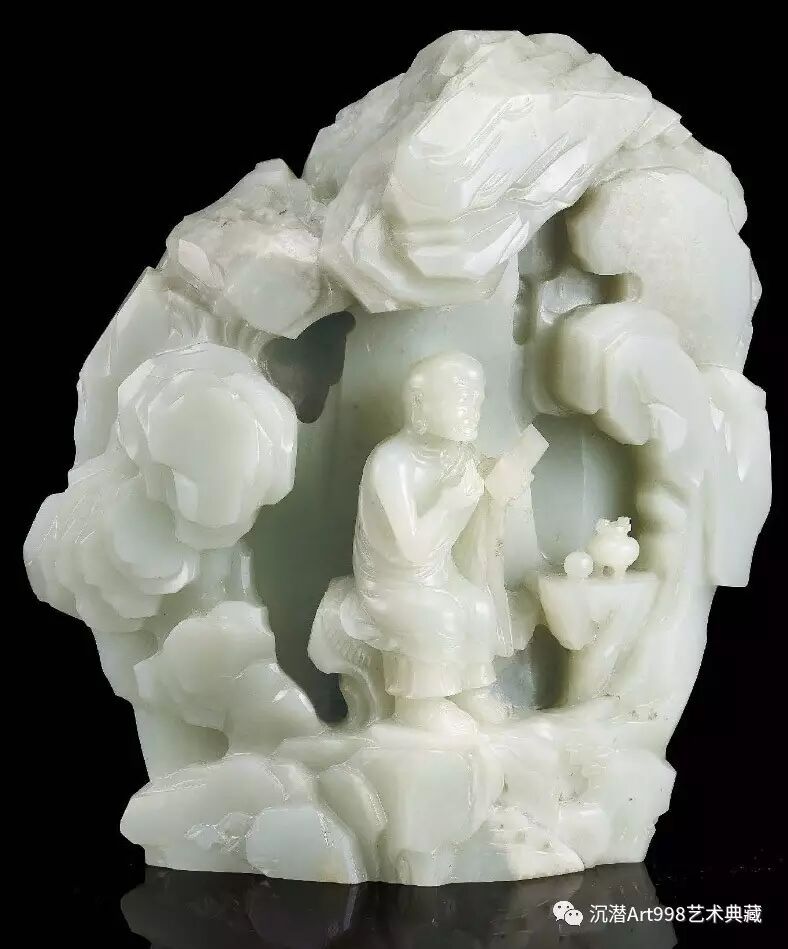 此山子雕工利落,層次豐富,生動刻畫阿必達尊者端坐石窟中,旁邊擺放著香爐及香盒,一手執拿經書,構圖跟五代高僧貫休作畫的十六羅漢圖非常接近。乾隆皇帝於1757年第二次南巡期間,到杭州西湖聖恩寺禮拜,並首次看到該寺收藏的貫休十六羅漢圖,對之大為欣賞,不但親筆在畫上題字,亦命宮廷畫師丁觀鵬仿畫。皇帝對十六羅漢圖珍重不已,朝廷亦出現大量以羅漢圖為藍本的藝術品,其中以玉器為多。如本山子上刻有乾隆年款及御題詩,可見乾隆帝非常珍愛以十六羅漢圖為題材的器物。故宮博物院藏一件嵌玉十六羅漢大屏風,上面阿必達尊者造型與本拍品非常相似,均是以貫休作品為藍本。另外山子底部刻寫《十六》,表示主題人物為第十六羅漢阿必達尊者,可從中推測當時供養的羅漢像不止一尊,非常有可能是一整套十六或更多尊。咸豐十一年,太平天國叛軍攻陷杭州,聖恩寺遭劫難,貫休原作從此流失,幸而通過各類獻予乾隆皇帝的羅漢圖文物如本山子,使今人仍能從中窺探貫休真跡之風采。1758年,清廷平定準噶爾叛亂,收復新疆,使得清廷能取得上好的玉料,也因此能作出精美的大型玉雕作品。此件玉山正是乾隆皇帝文治武功鼎盛時期的最佳見證。