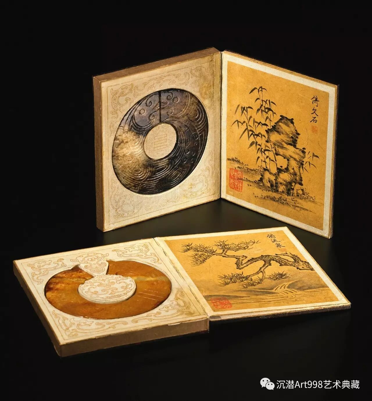 二冊裝裱形式統一,均為蝴蝶式,以淺湖色耿絹四邊鑲裱。對開則以數十層紙粘合在紫檀夾板上,按玉器形狀挖嵌,高下處皆覆以同色耿絹,並在四周及玉器中空處用細筆金線描繪龍、乾卦等圖案。畫竹裱褙用清仿宣德箋紙,保留了乾隆原裝,冊頁正反邊緣均有窄條染色皮紙包邊。畫松圖褙紙曾經舊修,改為棉連紙,褙紙上染色包邊不存,此圖褙紙邊緣有黃簽墨書「一百八十六」字樣,應為清廷原有編號。這種黃號簽,亦常見於清宮舊藏書畫捲軸包首或冊頁上。