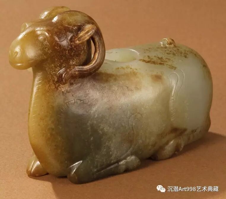 此件青玉器為臥羊形,與同時期一種羊形銅燈形式相類,如中山靖王劉勝墓中出土,現藏於河北省博物館的一件羊形燈即為如此,見《中國文物精華大辭典》,香港,1995 年,320 頁,1148 號(圖二)。雖名為水丞,但其功用並不非常明確。頭上及背上的兩個環扣原應繫有配件,或為銅製,今已佚失。清宮舊藏有一件漢代羊形水丞,著錄於《故宮博物院藏文物珍品全集: 玉器(上)》,第40 冊,香港,1995 年,239 頁,編號200(圖三)。然而學者卻認為它極有可能於明朝時掏膛改造。本器並無後改痕跡,其掏膛應為原製。另有可能本器本為某種容器,或用以貯存丹藥之類。揚州甘泉老虎墩東漢墓出土的一件飛獸形玉容器,現藏於揚州市博物館,著錄於《中國玉器全集(4): 秦漢- 南北朝》,河北,1993 年,181 頁,圖版251 及252 號。此器也曾被定為水滴,但現在有學者認為其或為丹藥罐。